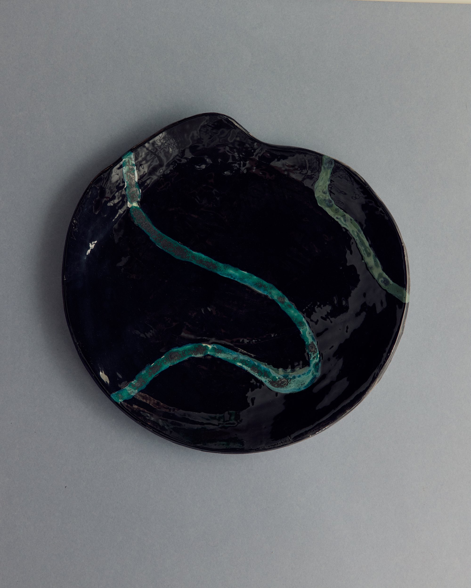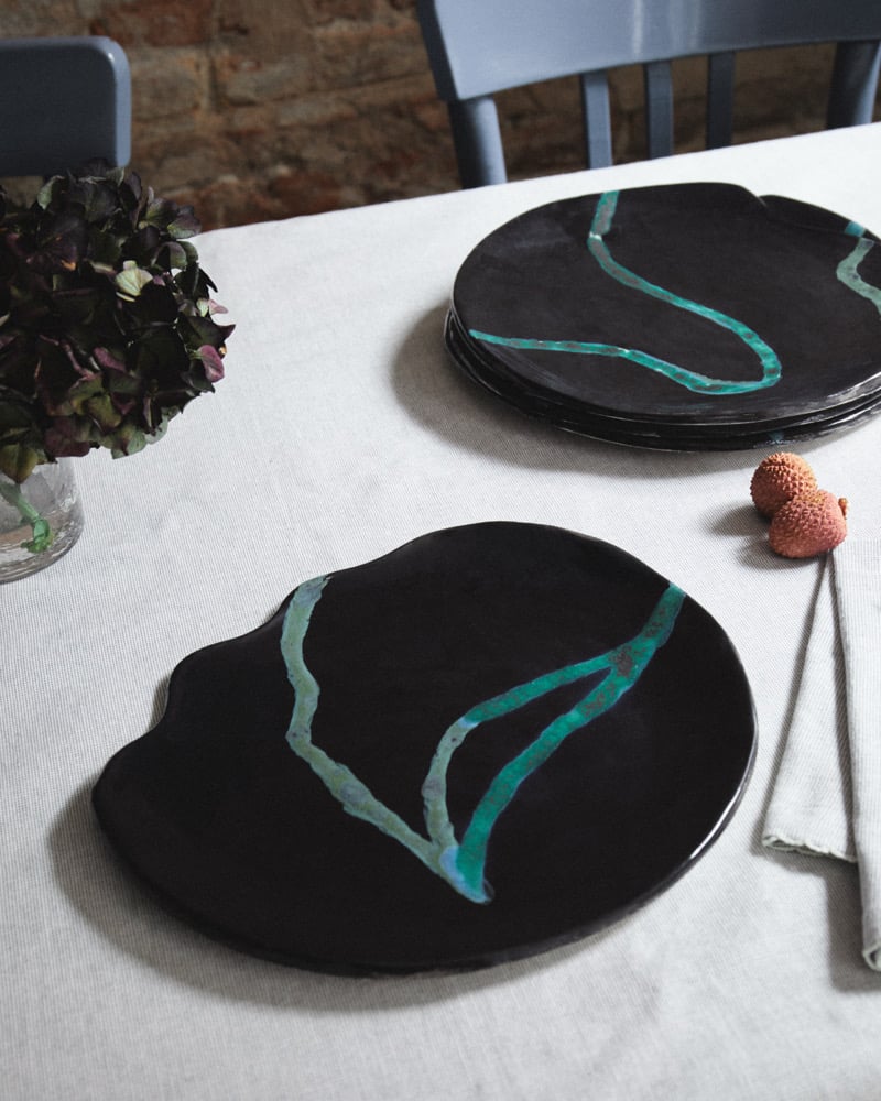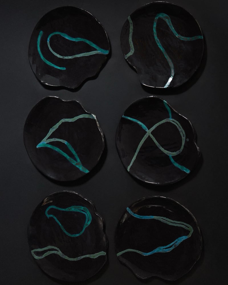 Each plate is unique, yet the set is conceived as a complete work, where the pieces converse with one another, forming a fragmented vision. Inspired by posidonia meadows and the reflections of water, the collection moves between the functional and the artistic. Designed both for use and to be experienced as an artwork.