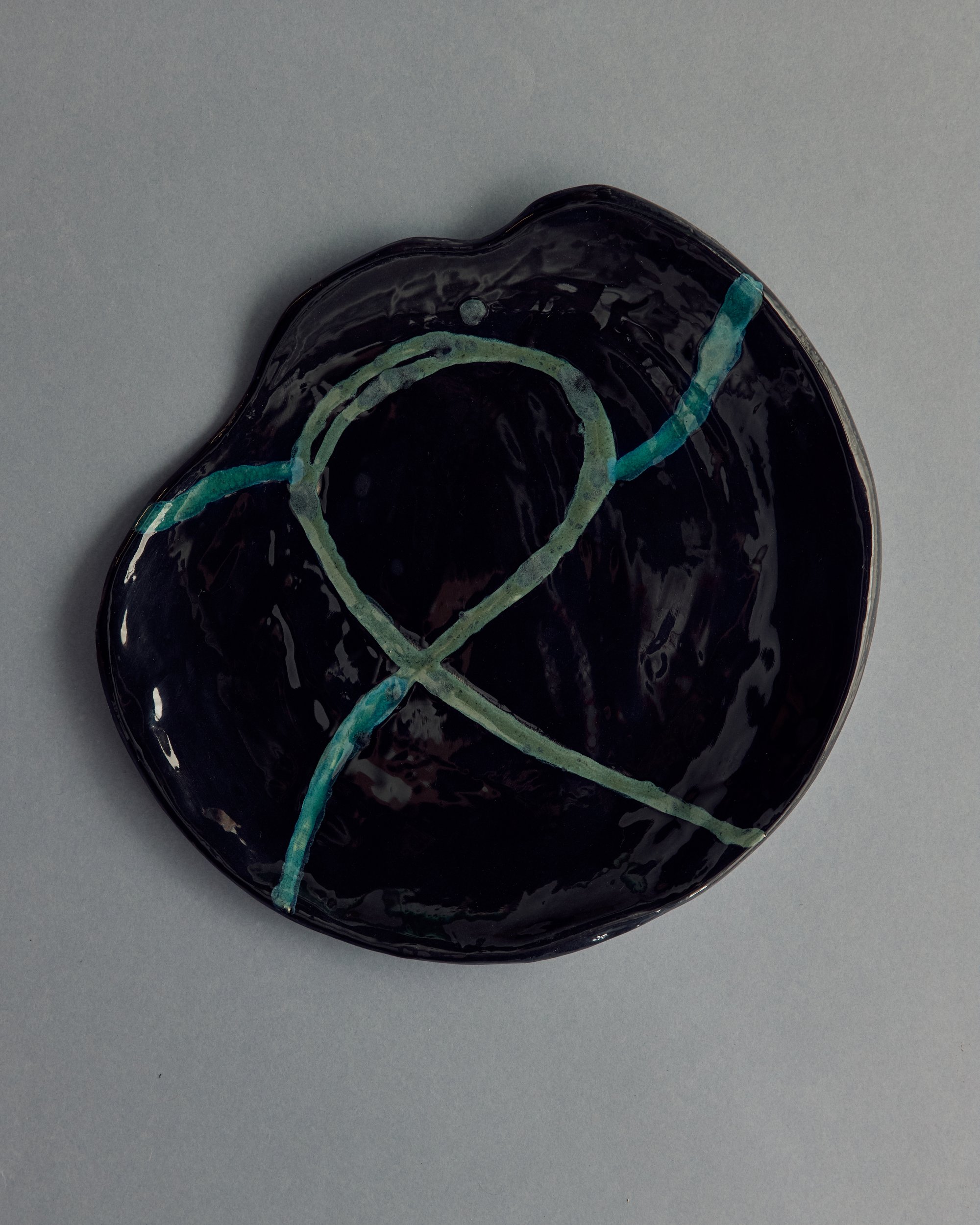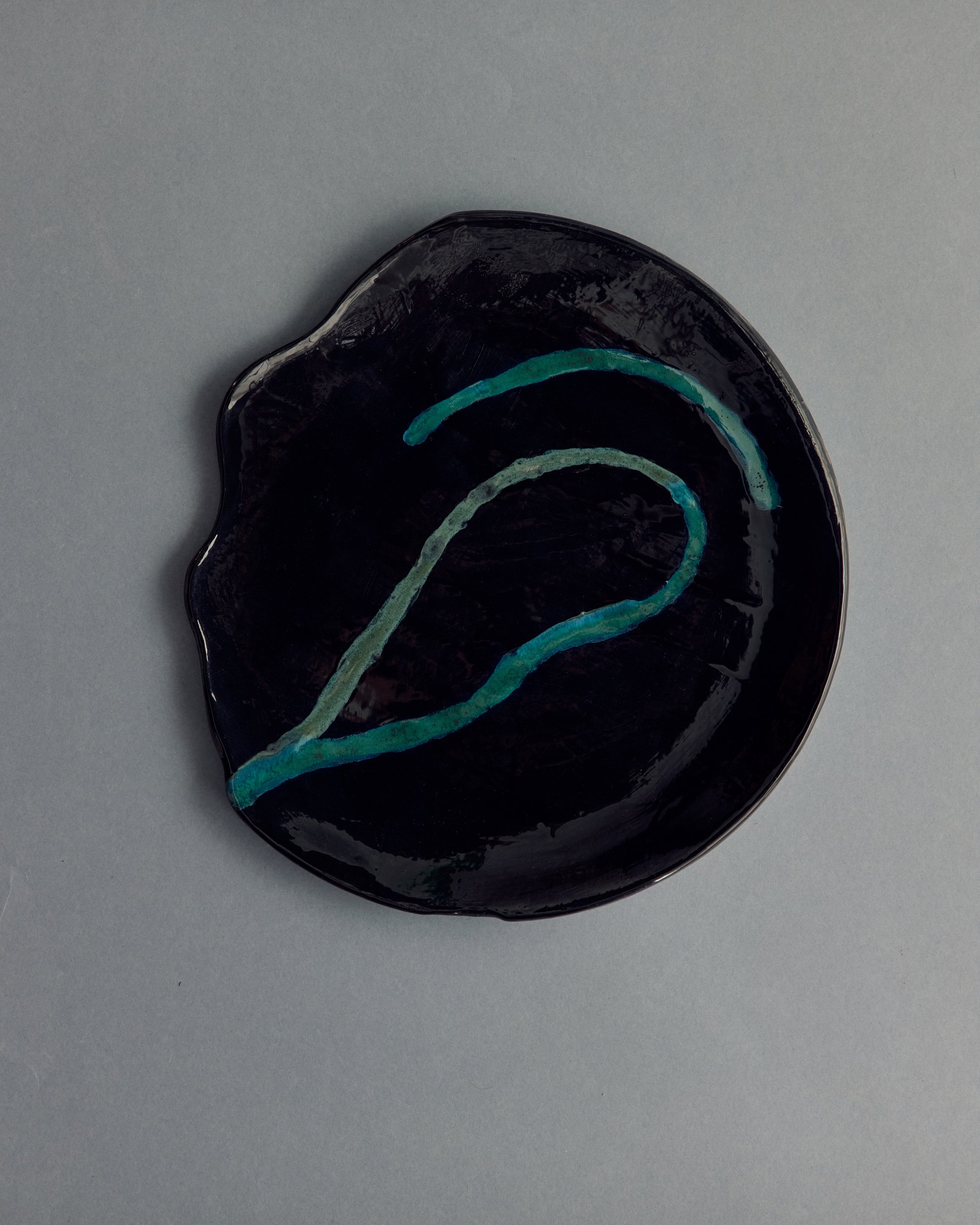 Bajo la superficie is a work composed of six plates that function as a narrative whole. Made in ceramic with low-temperature glazes, the pieces share a deep black base—reminiscent of submerged seascapes—over which pictorial compositions unfold in deep blues, mineral greens, and translucent turquoise washes, creating subtle plays of light, contrast, and depth.